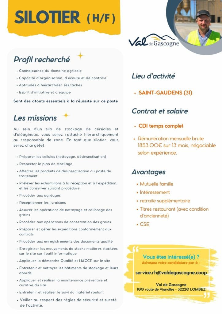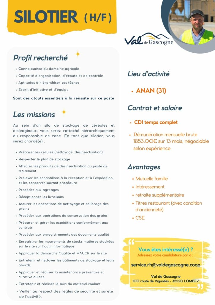Merci d'adresser votre candidature CV + Lettre de motivation à : a.bonnet@valdegascogne.coop